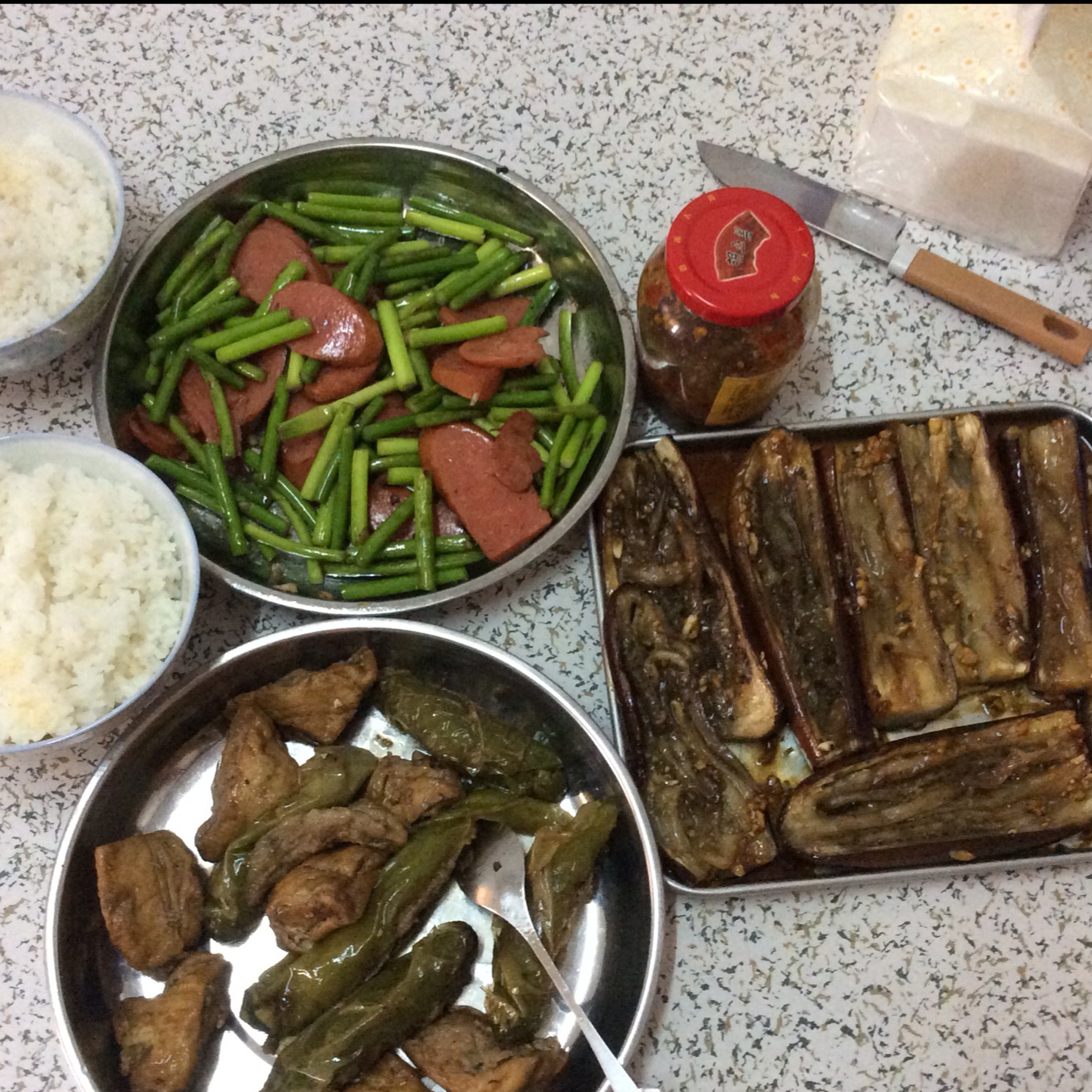 香肠炒蒜苗,蒜烤茄子,酿青椒酿豆腐,颇具南宁特色的一餐,呀咪!