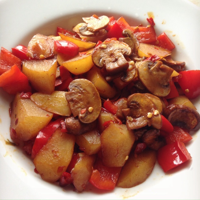 彩椒香菇烧土豆 家里实在没有别的菜了...这几种凑一起味道其实还不错~