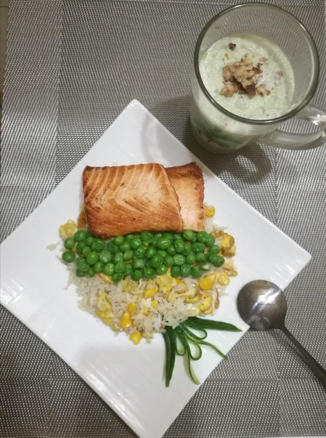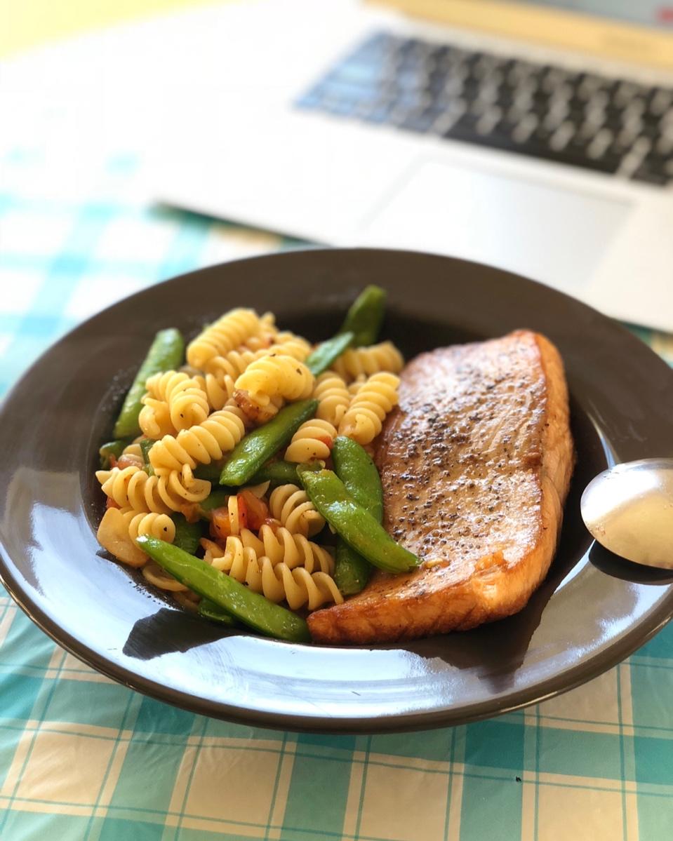香煎三文鱼配甜豆意面