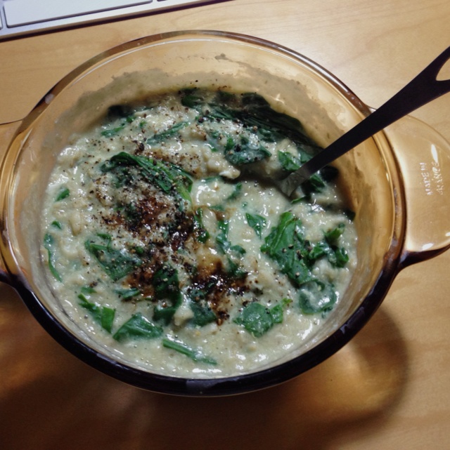 我是做晚餐。。。然后没加牛奶加了菠菜,于是也就没加糖加了酱油和胡椒。所以就是用水煮燕麦,然后打蛋花放菠菜。懒人晚餐。。。...