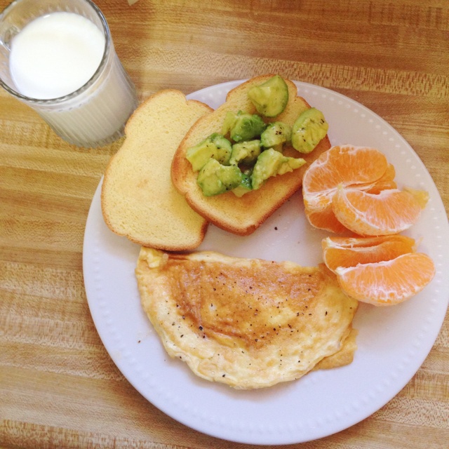 omelette+牛油果面包+牛奶+橙子