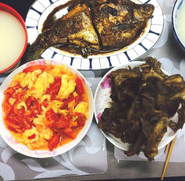 红烧鳊鱼 西红柿炒鸡蛋 卤鸭锁骨