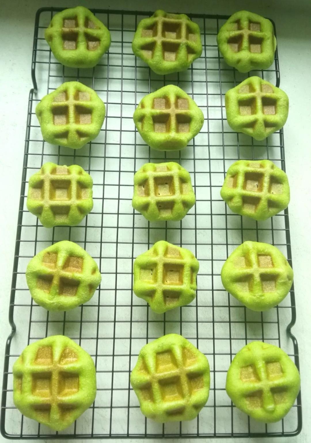 菠菜汁华夫饼,酵母版,里面加了蜜豆。