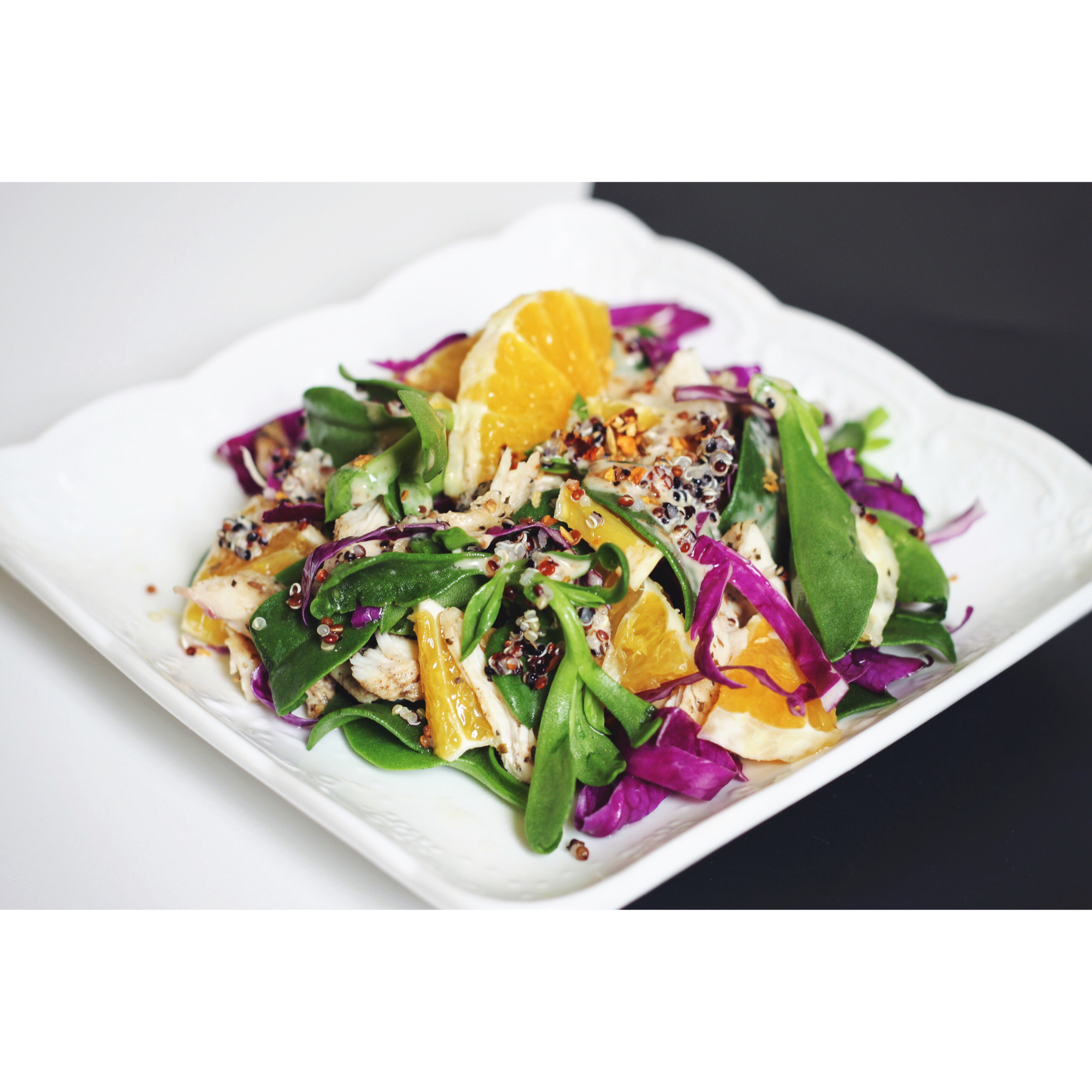 橄榄油煎意式香料鸡胸、半颗橙子、一堆草、一丢藜麦和一些焙煎芝麻色拉汁……