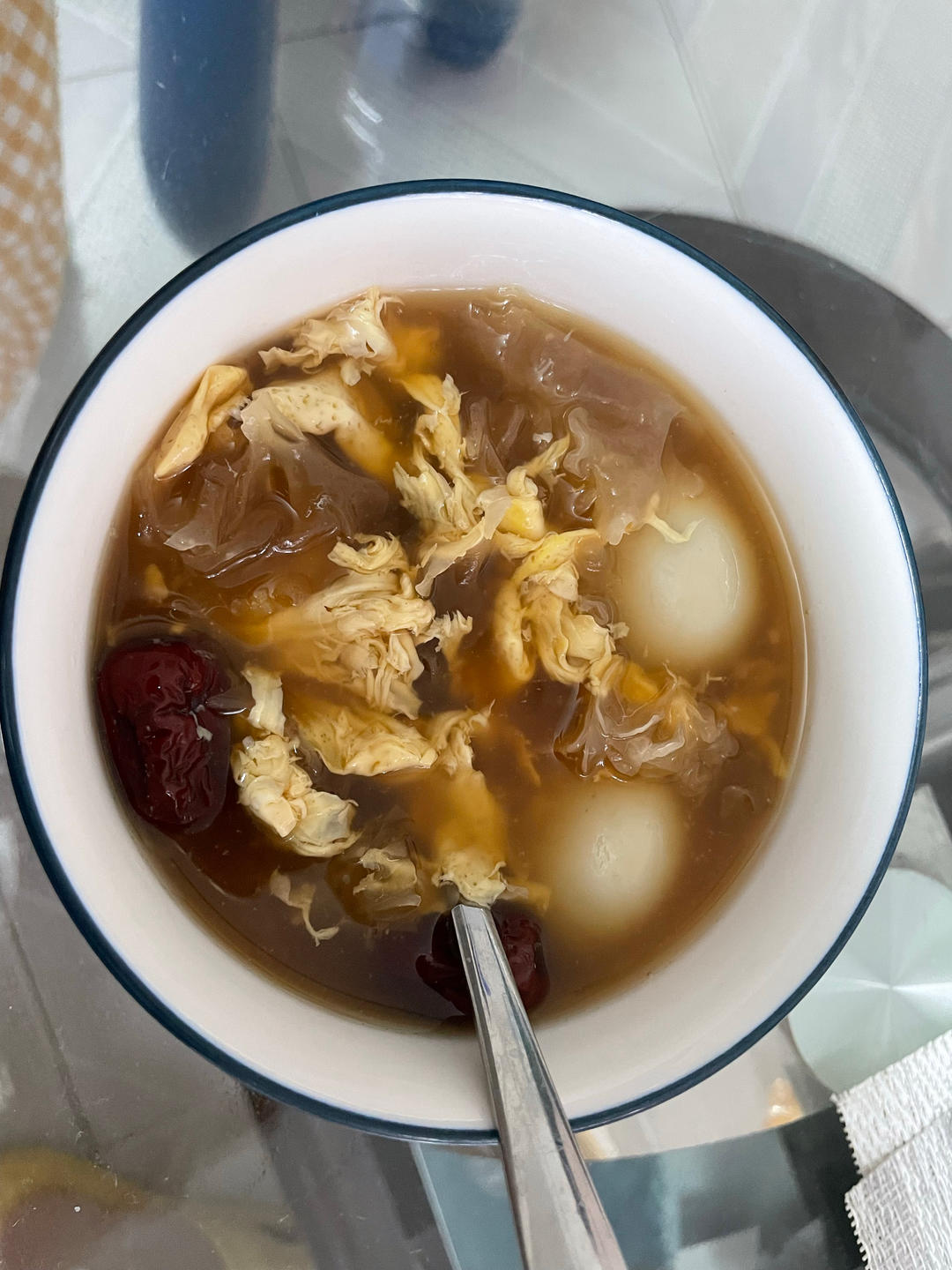 汤圆、银耳、鸡蛋、红枣枸杞,热乎乎的一碗糖水,很舒服^_^