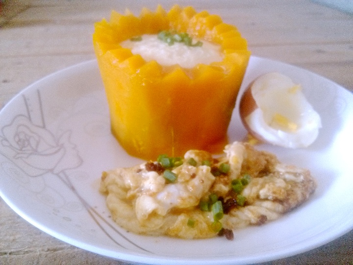 找遍整个菜市场,没有卖圆南瓜的,无奈之下挑了个长南瓜回来加工。取瓜蒂段,掏“肉”拗造型,体积太小,居然容了半个水蒸蛋的量...
