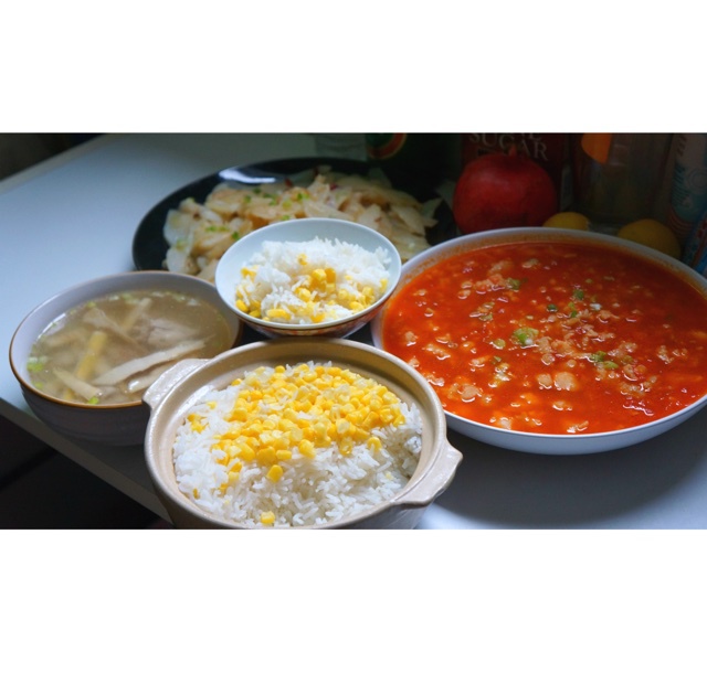 番茄鱼 炒山药 玉米饭 竹笋排骨汤