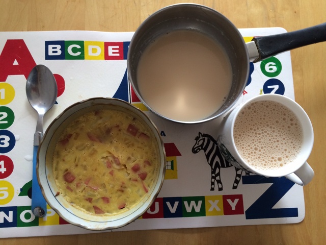 洋葱红肠土豆蒸蛋,普洱玄米奶茶