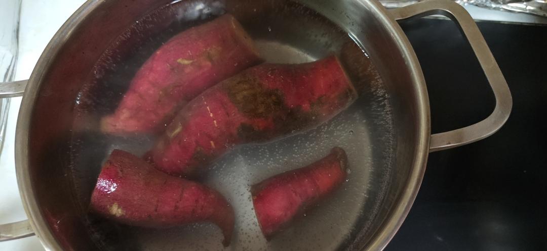 1.红薯洗干净 放冷水里加盐🧂水开煮6分钟(必须先煮,这样熟得更快 而且红薯更甜)