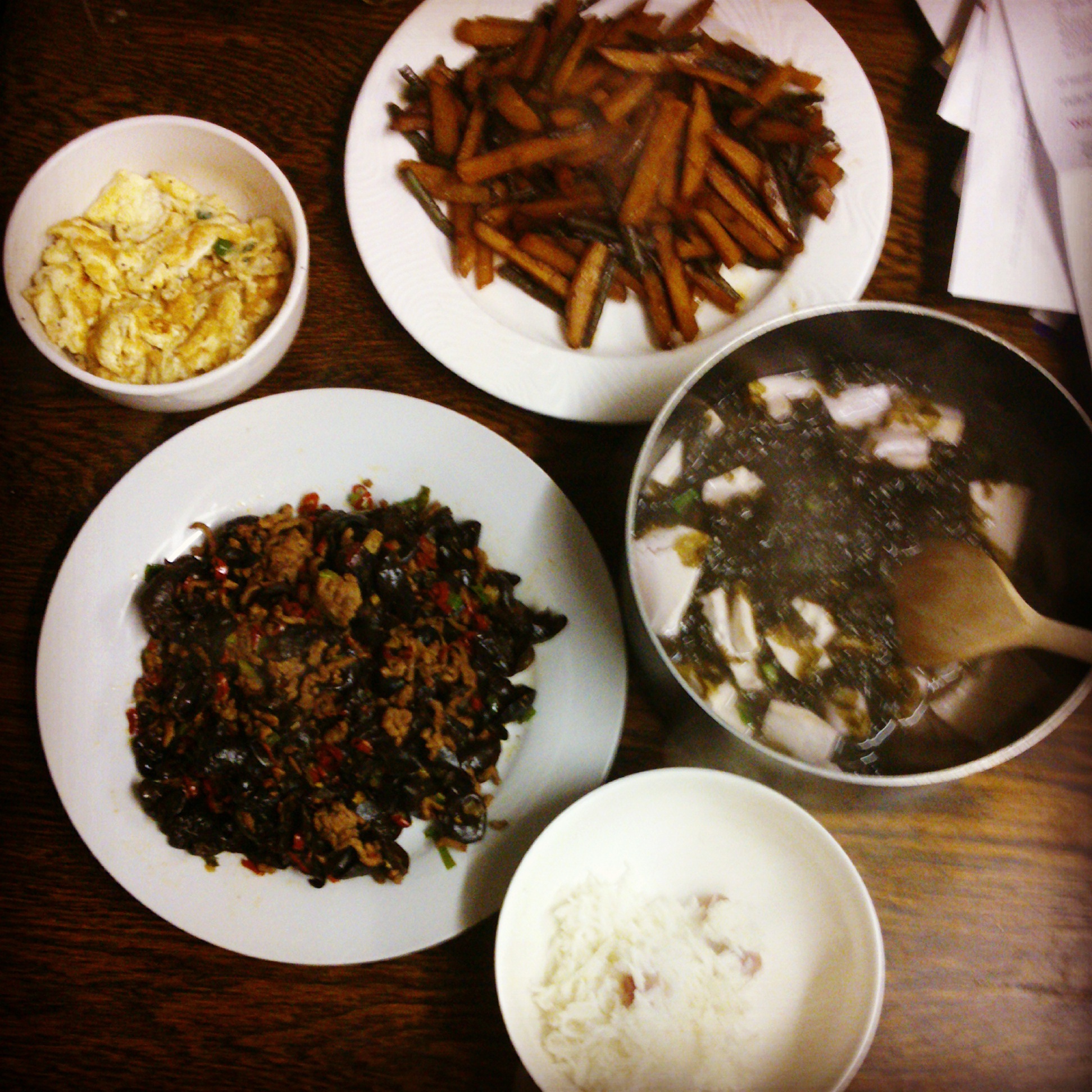 和新室友一起做的晚饭,我自己做的一道木耳炒牛肉和一锅紫菜豆腐汤都手抖放咸了……