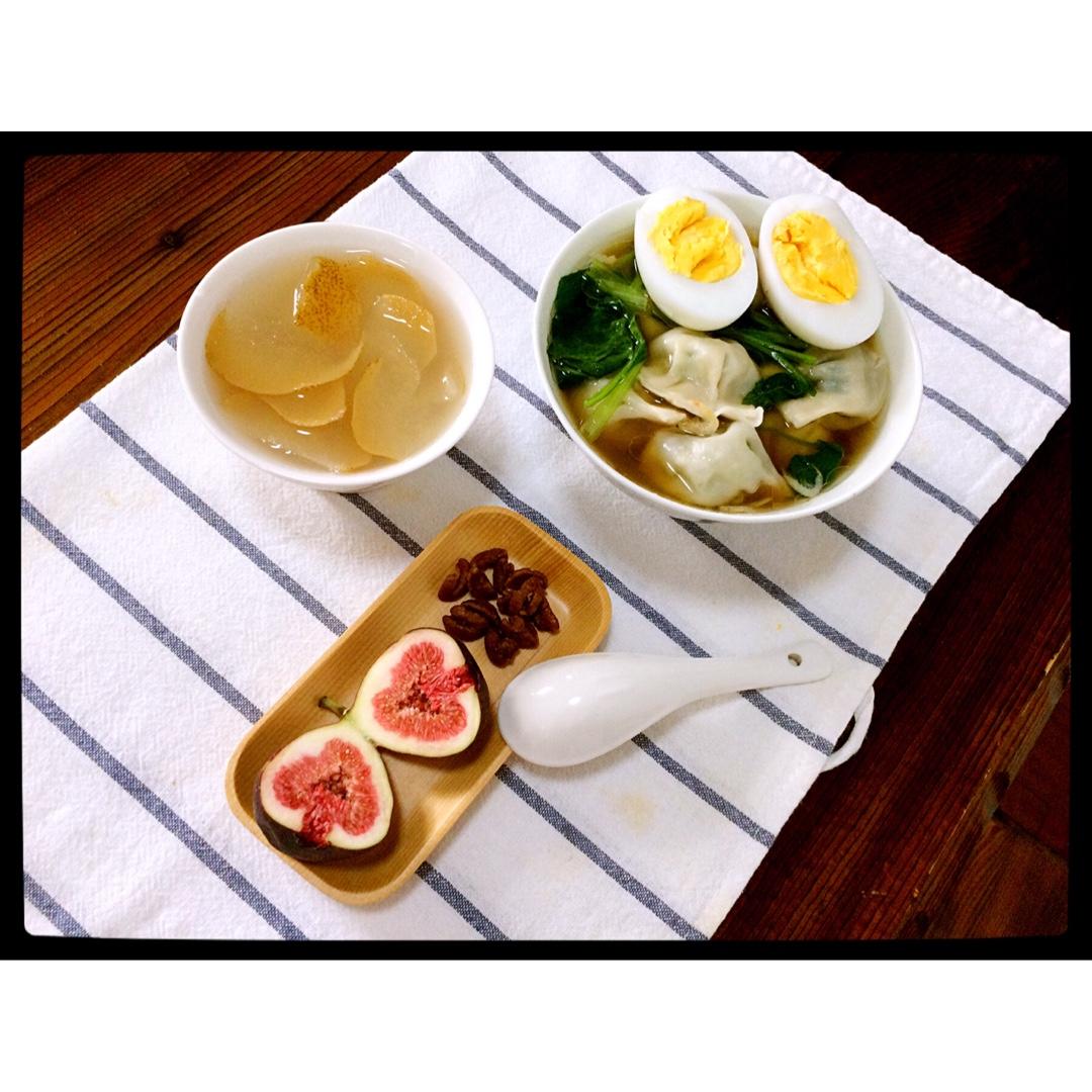 ^_^ 2016.10.13 韭菜饺子+水煮鸭蛋+冰糖雪梨+无花果+野生山核桃仁。 #早餐•2016...