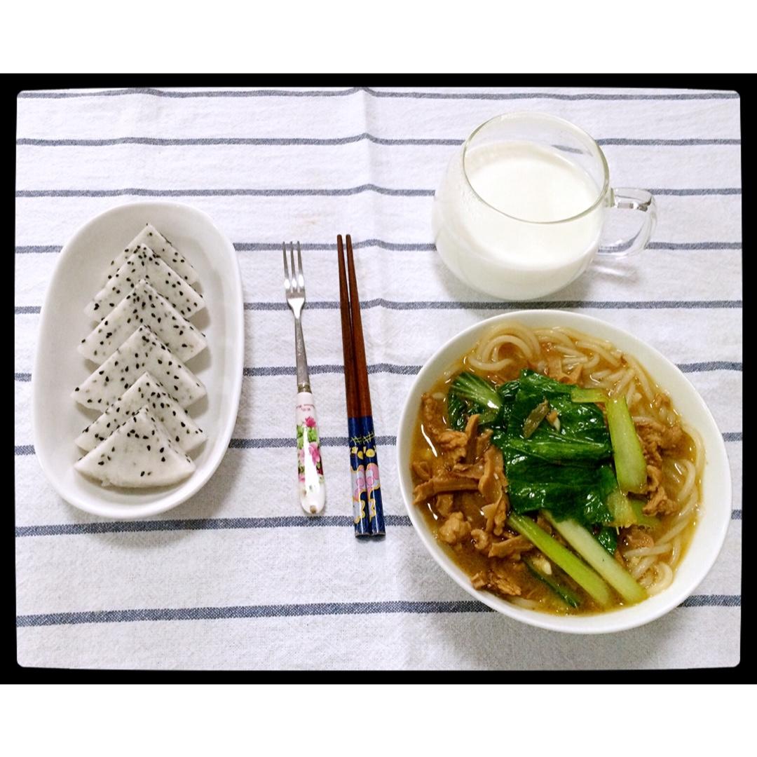 ^_^ 2016.9.29 牛奶+青菜肉丝汤粉+火龙果。