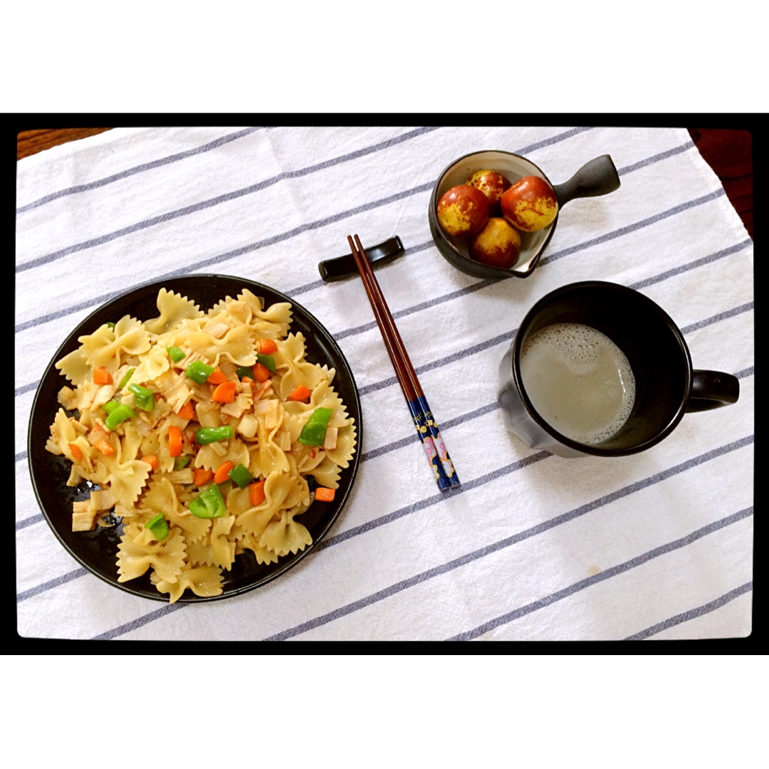 ^_^ 2016.9.21 芝麻核桃乳+瑶柱海鲜蝴蝶面+冬枣。蝴蝶面里加入了瑶柱和蟹肉棒,只能一个字...