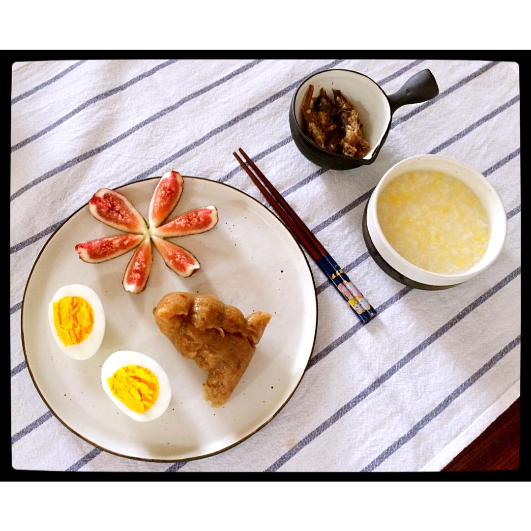 ^_^ 2016.9.27 小米粥+肉粽+水煮鸡蛋+炒小鱼干+无花果。溪的食量有所增加,这些吃完后还...