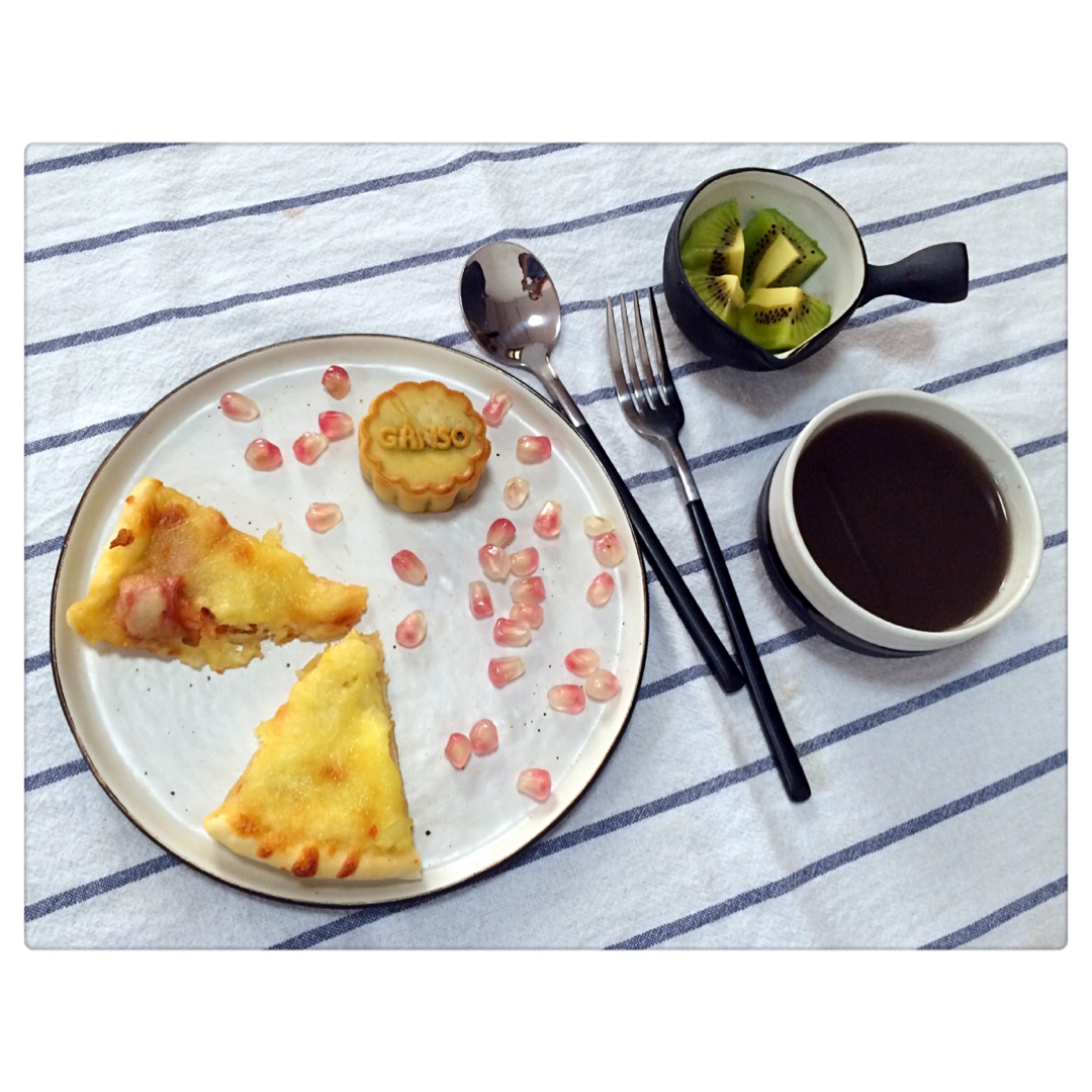 ^_^ 2016.9.18 榴莲红豆汤+榴莲披萨+虾仁培根披萨+红豆月饼+石榴+猕猴桃。 #早餐•2...