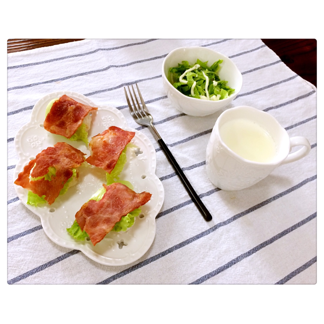 ^_^ 2016.9.19 牛奶+培根生菜饭团+生菜沙拉。☺️☺️☺️ #早餐•2016年9月19日...
