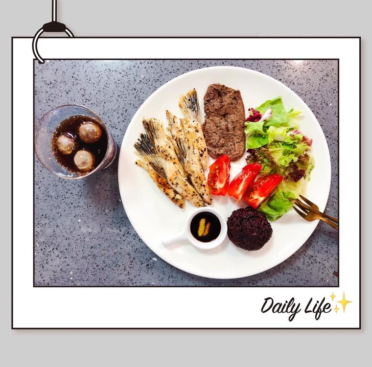 香煎三文鱼鳍🍣➕黑椒牛排🥩➕蔬菜色拉🥗➕紫米饭🍚➕零度冰可乐
