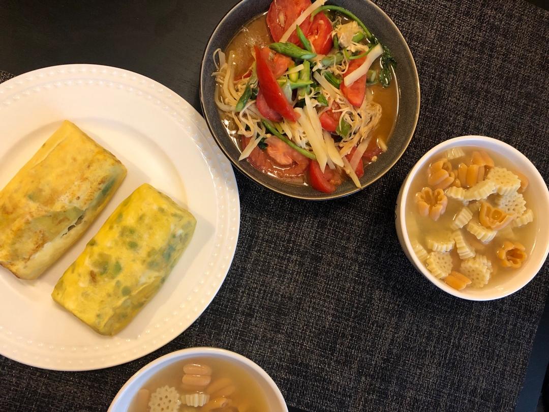 5/22晚餐: 杂蔬什锦、牛油果厚蛋烧、鸡汤pasta