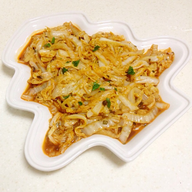 厨房台面上早就放着一小颗白菜,昨天终于把它炒成辣白菜了,我吃掉了一大半,