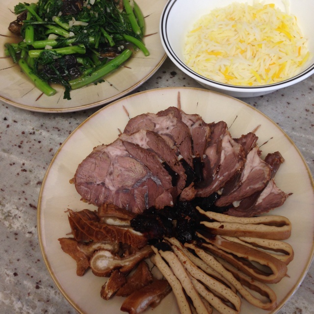 卤味三拼,蒜炒茼蒿蘑菇,配白饭
