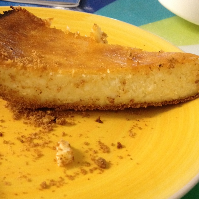 自制芝士蛋糕太美味两人抢着吃哈哈。 昨晚做的放冰箱冻了一个多小时就等不及吃了。两人一晚就吃掉一个! #午餐•2014年1...