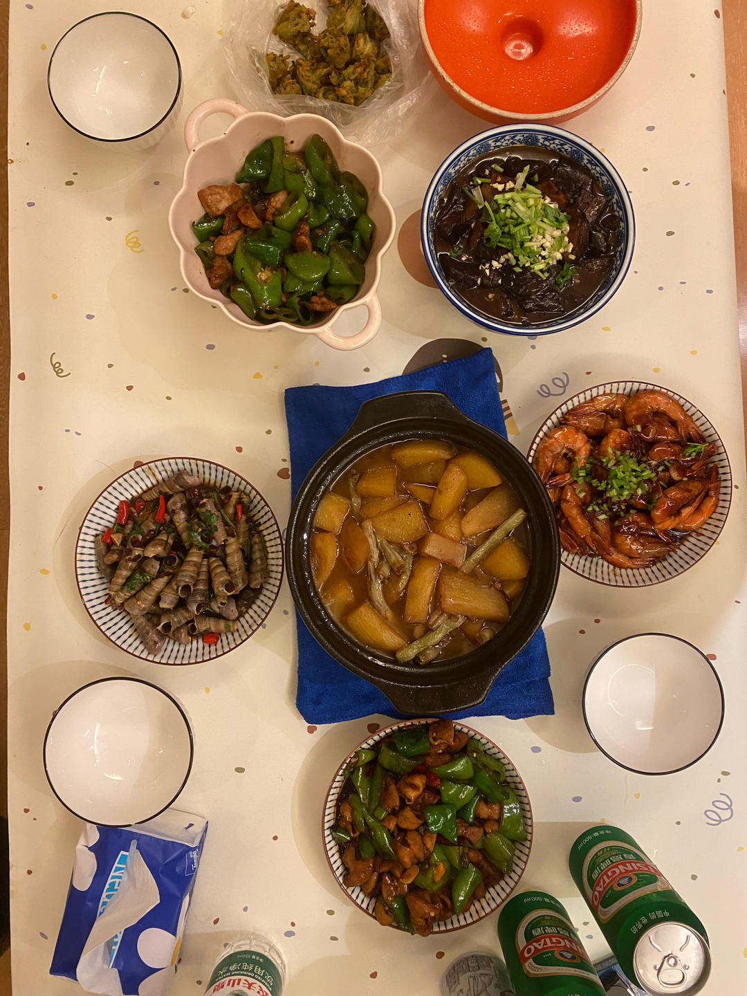 土豆芸豆炖排骨,辣椒炒肉,辣炒大肠,油焖虾,红烧茄子,酱爆钉螺