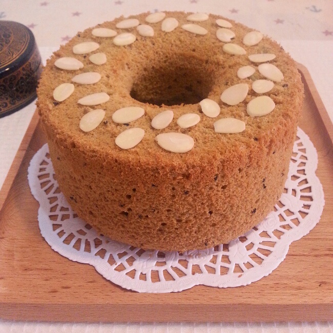 我的第四个戚风!!哈哈,这次是徒手脱模的,果然好多了,不过底部实在弄不下来,还是下刀了。我就不说杏仁...
