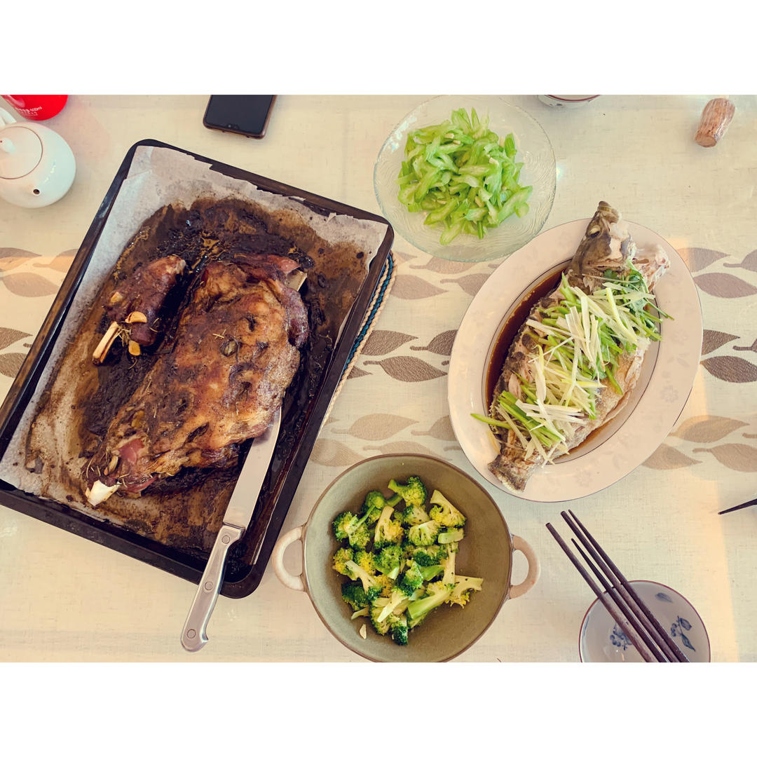 羊腿还是过年的存货,都是腌制好的,中午没有解冻好,我就负责烤,210°C用时75分钟