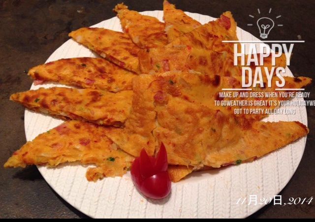 权阿姨自制韩式泡菜煎饼,Lily加工后的成品出锅啦。