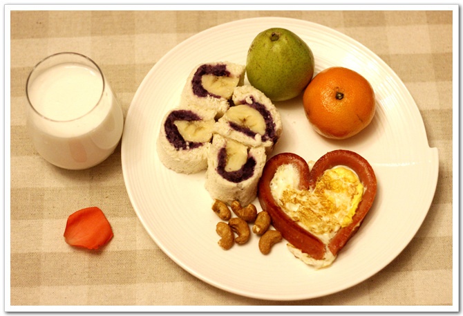香蕉紫薯吐司卷+火腿肠煎蛋+桔子香妃梨+腰果+牛奶