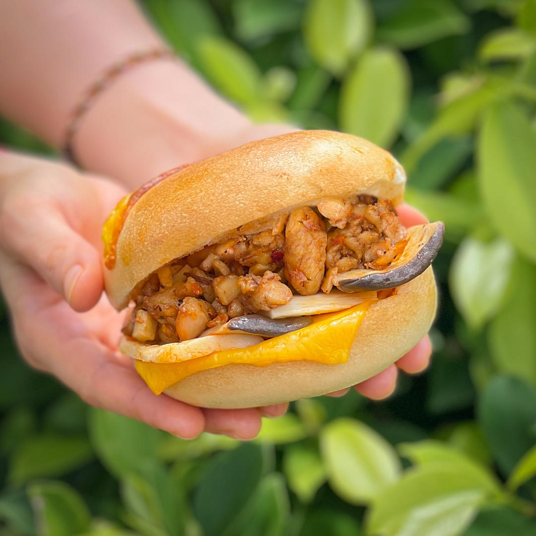 辣鸡杏鲍菇贝果三明治