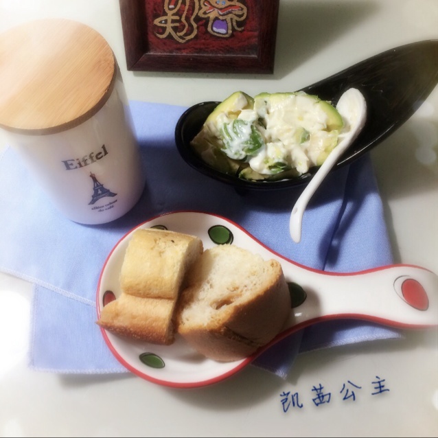 一个人的早餐:唐僧一早蒸点心和儿子吃了,我就随意啦:牛油果沙拉配法棍,还有酵素(餐前喝完了的,空...