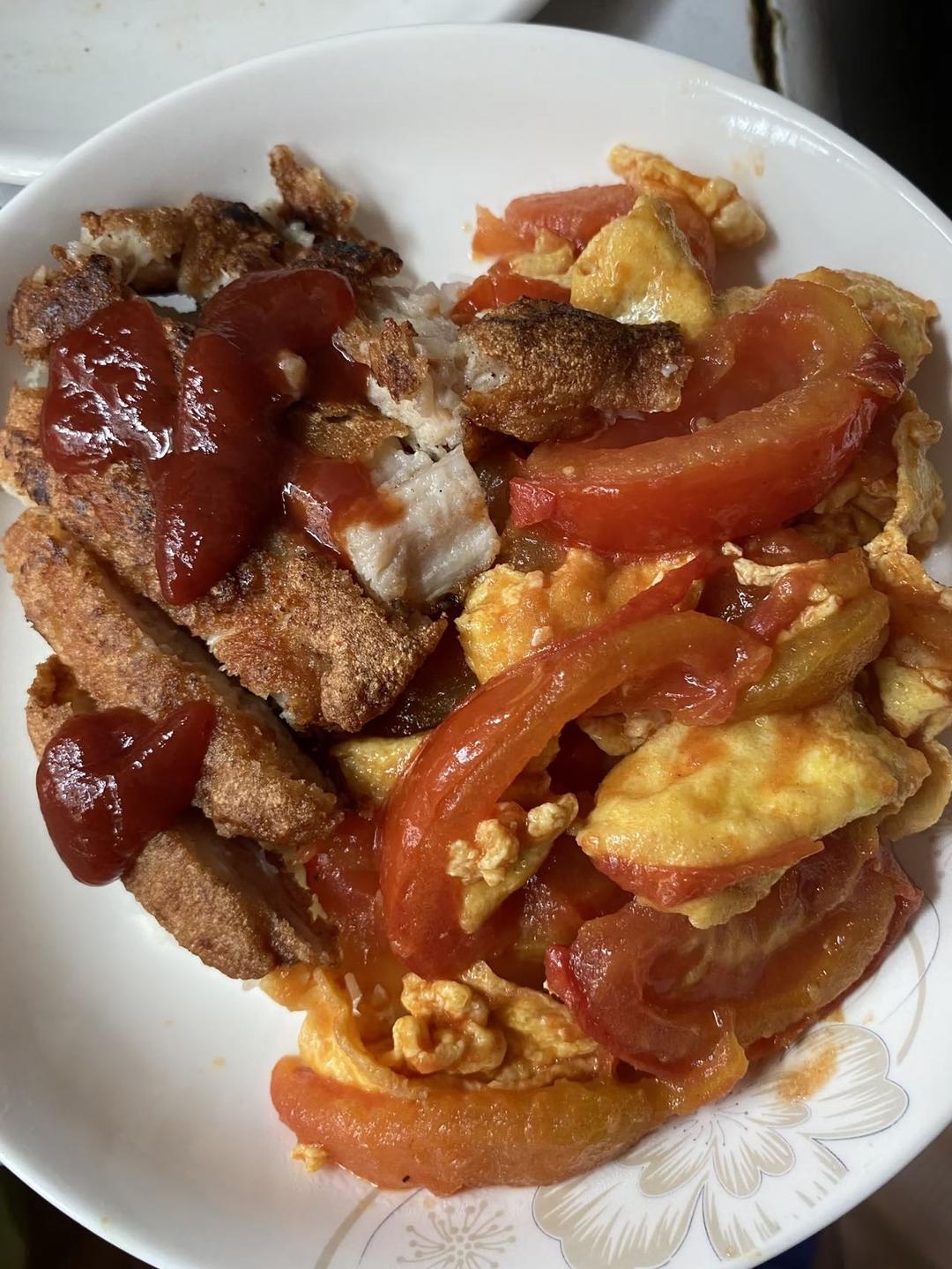 为了消耗油辣子我也是拼了。铁番茄炒蛋浇盖一勺子油辣子。味道也不奇怪。