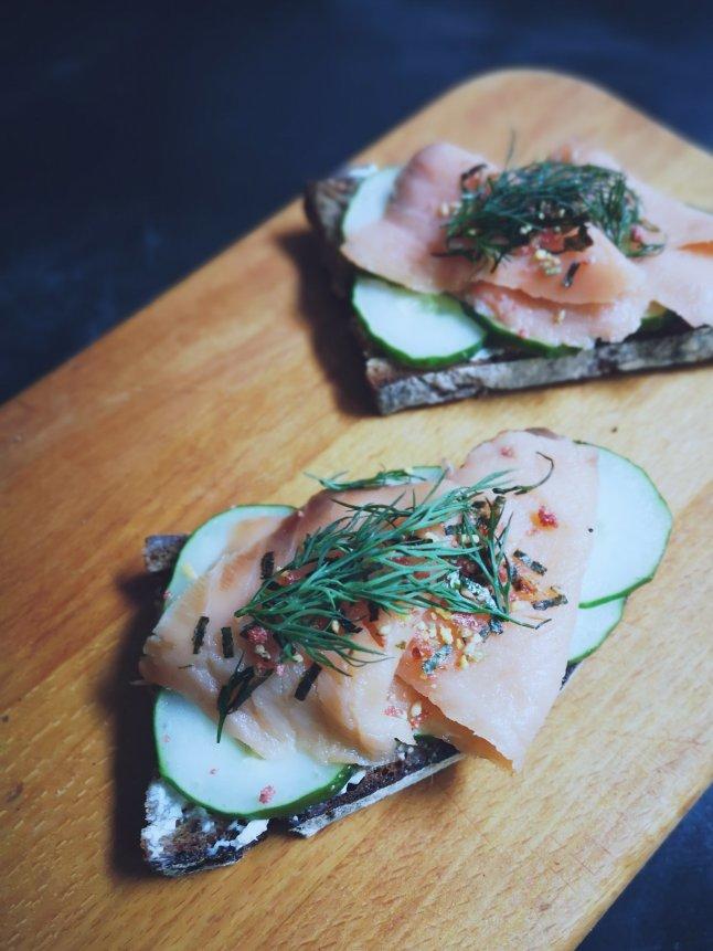 丹麦开放式三明治:黑麦面包、奶油奶酪、黄瓜、Dill、烟熏三文鱼