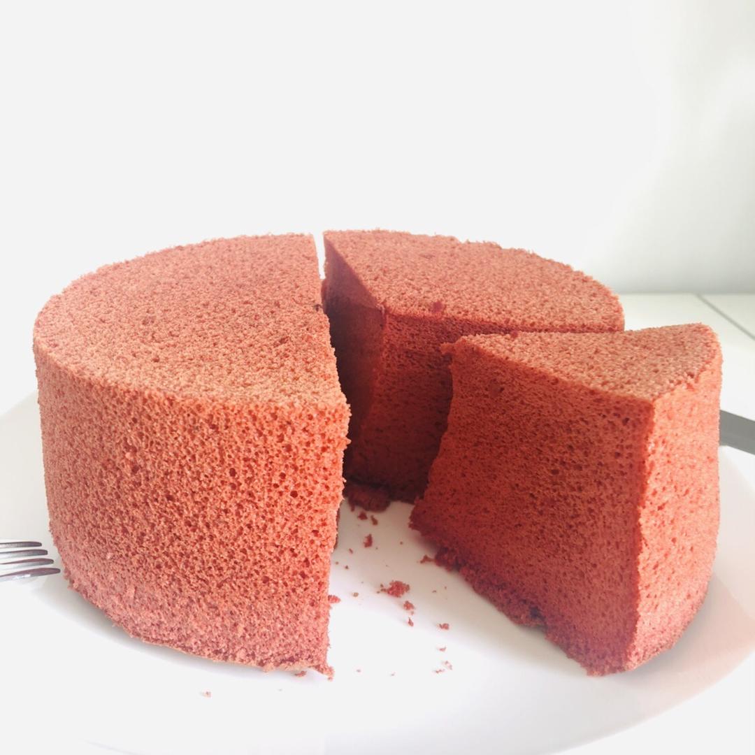 完美6寸配方,没加可可粉,就是红色戚风,白糖加到50克。组织很绵软,可以回弹,以后可以换个抹茶粉试试。