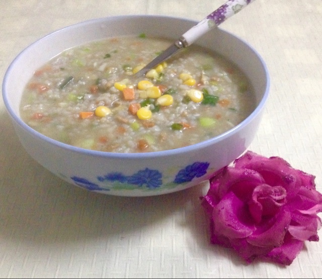 刚熬好的热腾的晚餐。肉沫,鸡蛋,香菇,胡萝卜,玉米,白菜,小葱,味道那叫一个鲜啊! #晚餐•2014年12...