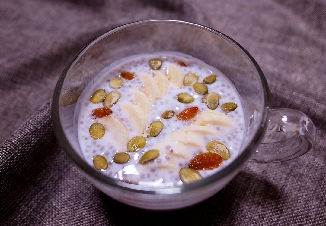 第一次尝试,加了酸奶、葡萄干、南瓜子、芭蕉。清清爽爽,全家爱了。