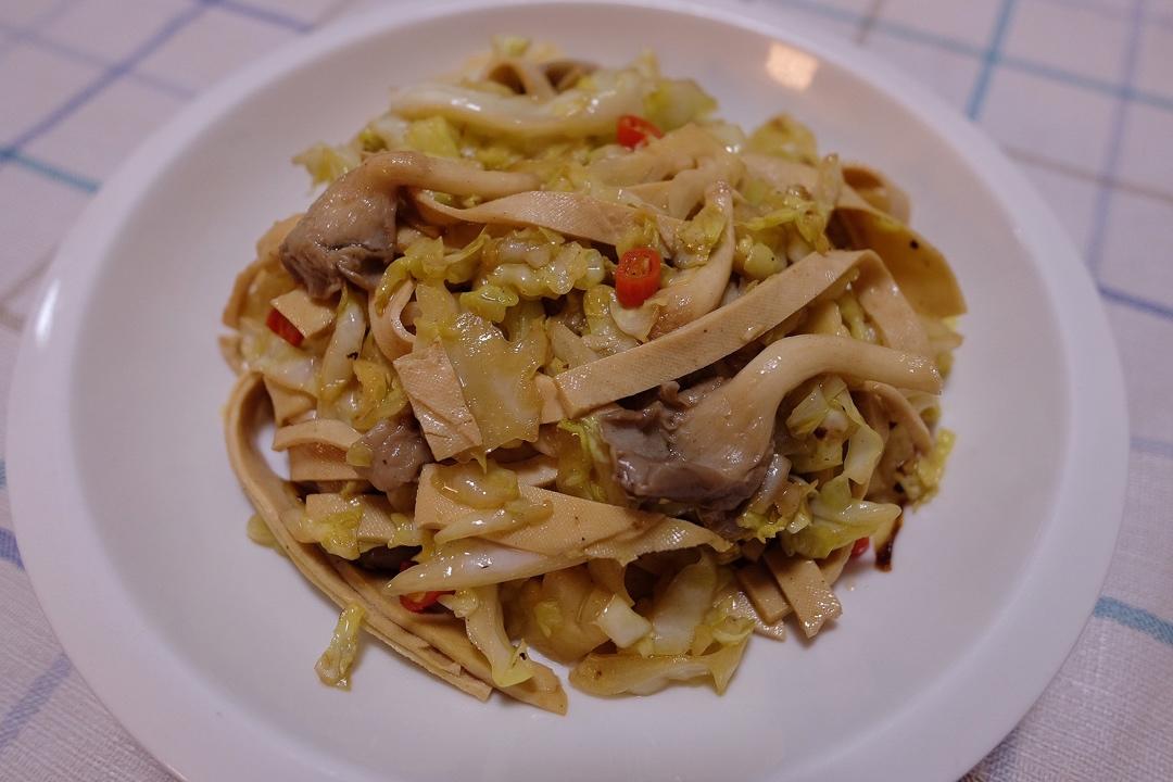 平菇、厚百页、卷心菜。同类菜一起炒,这样带饭方便。