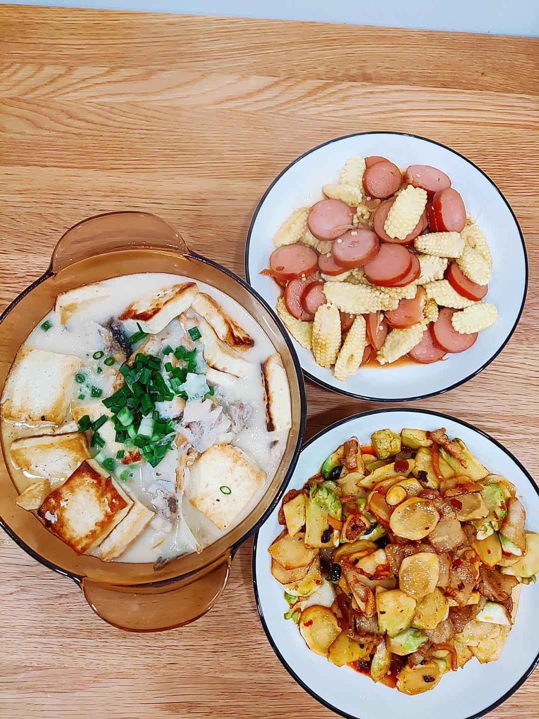 五花肉炒儿菜 火腿肠炒玉米笋 鱼头豆腐汤