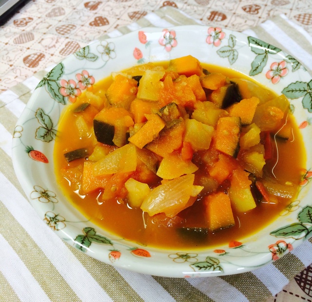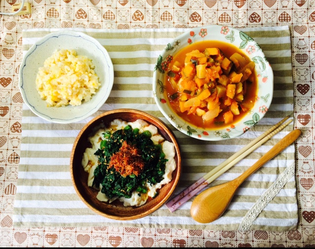 【番茄南瓜土豆煮+瑶柱丝茼蒿豆腐泥+南瓜土豆燕麦饭】