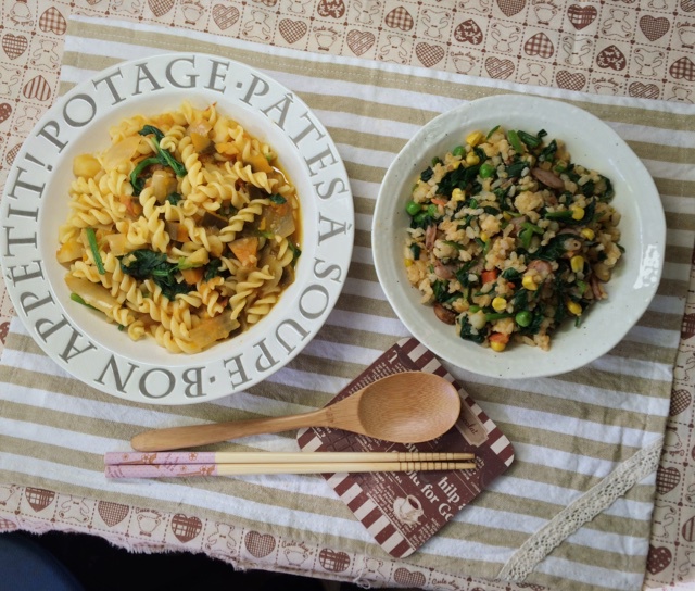 【番茄南瓜土豆菠菜烩螺旋意面+菠菜香肠炒饭】