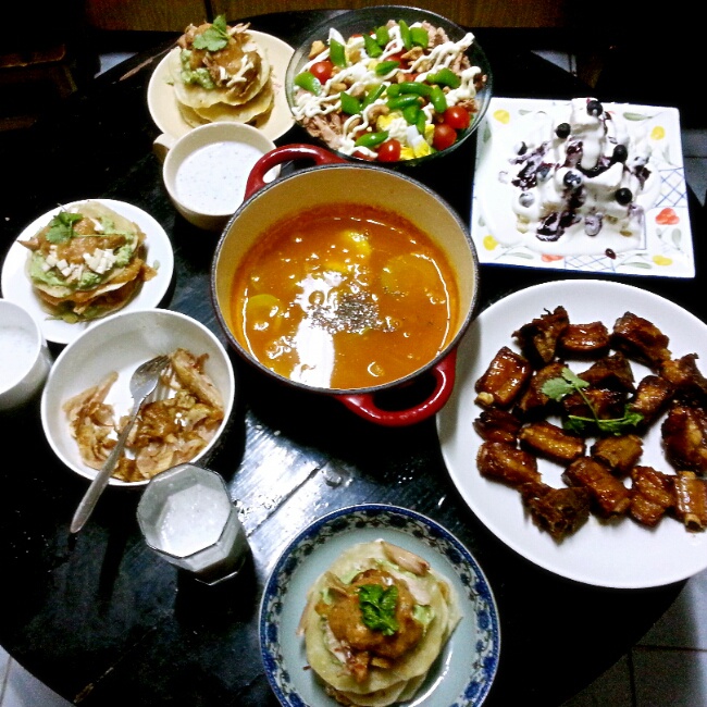 南瓜汤,蜜汁排骨,墨西哥薄饼塔,金枪鱼沙拉,...