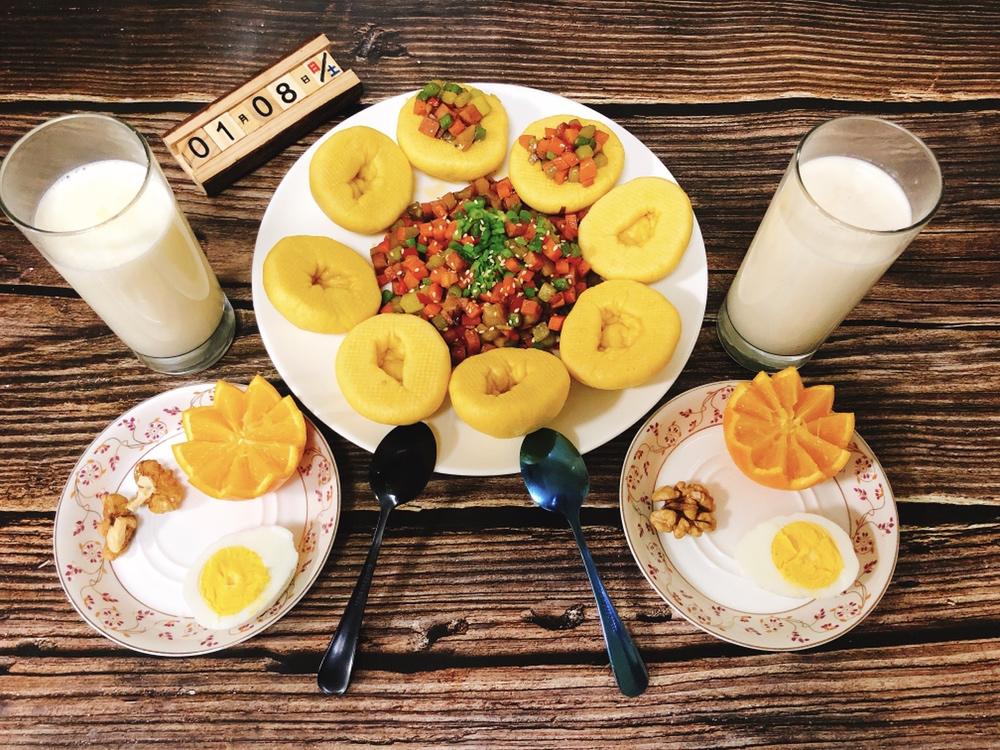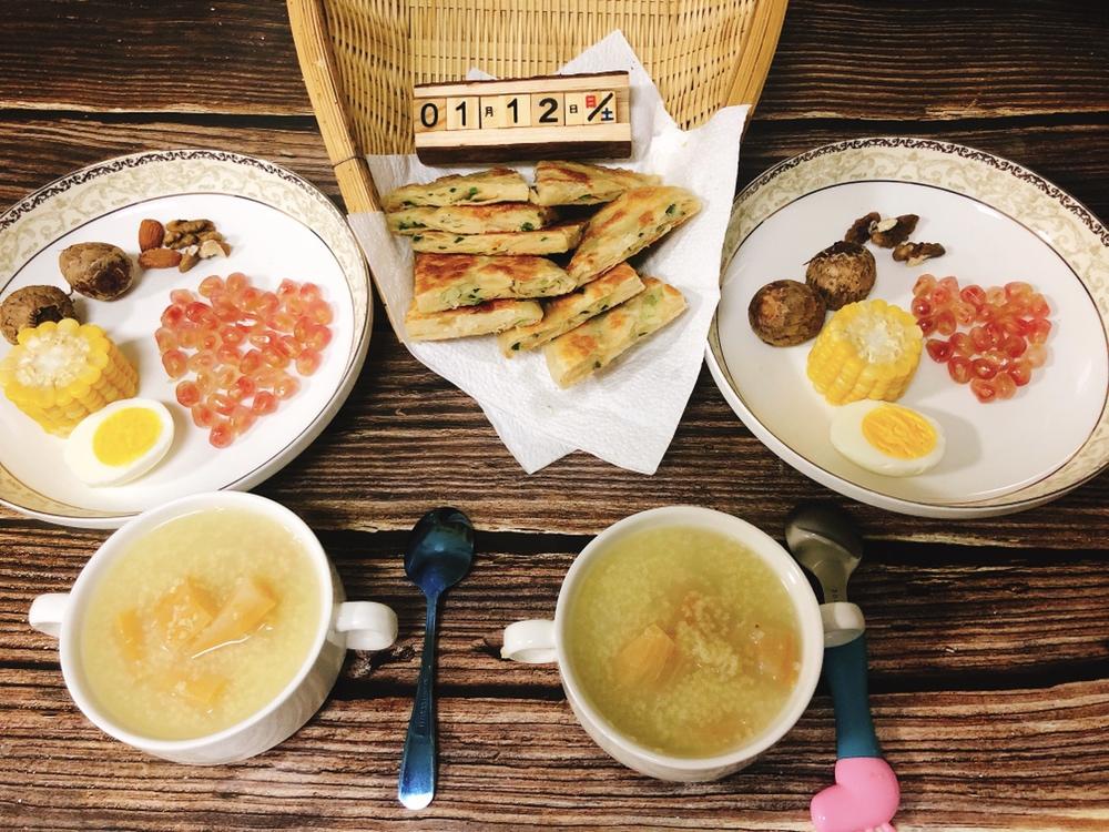 刘先生:鸡蛋🥚➕坚果➕小米山药粥➕葱油饼➕玉米🌽➕芋头➕石榴
