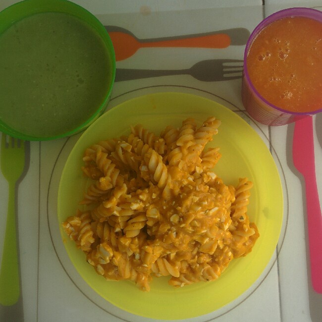 咸蛋南瓜意面+胡萝卜芒果汁+豌豆浓汤