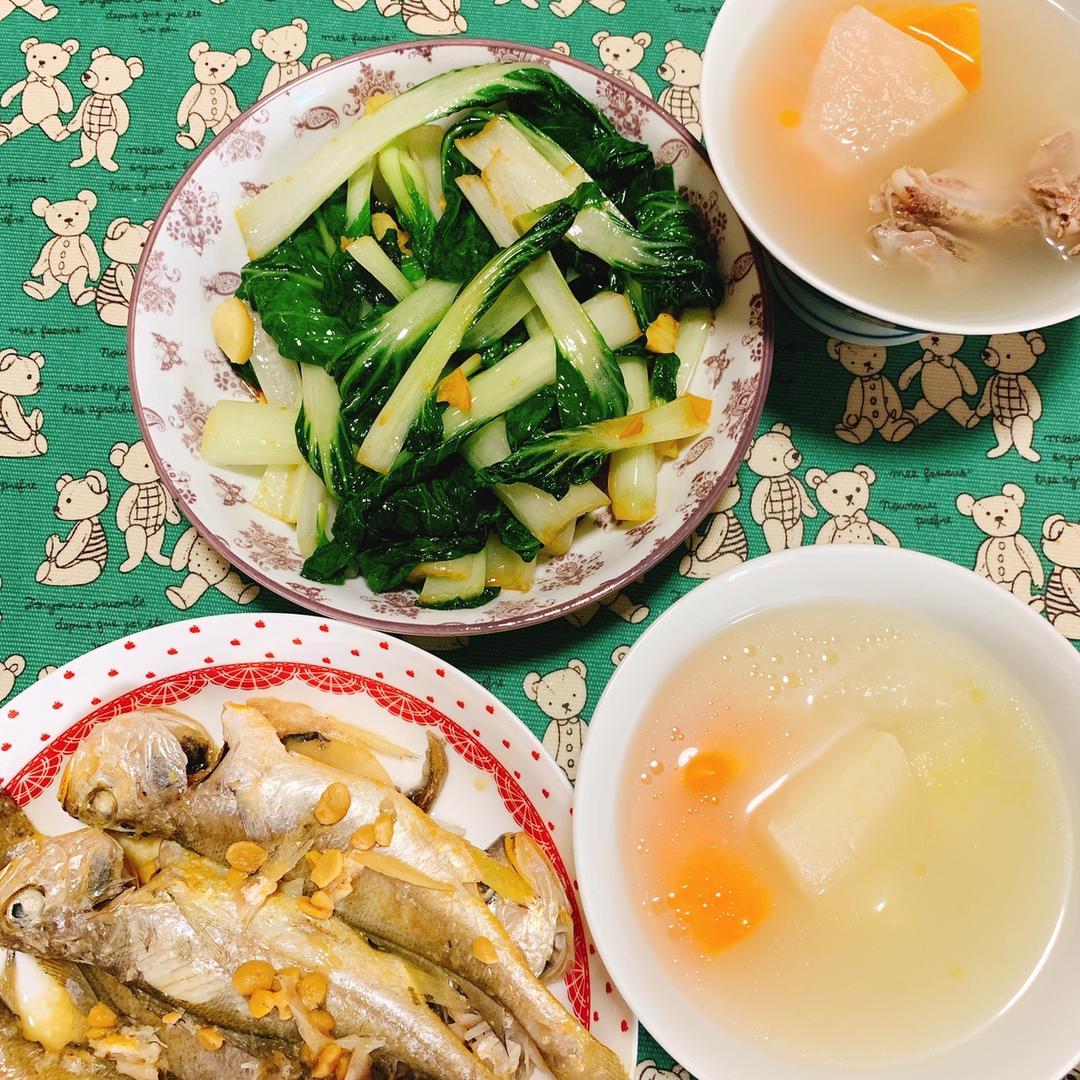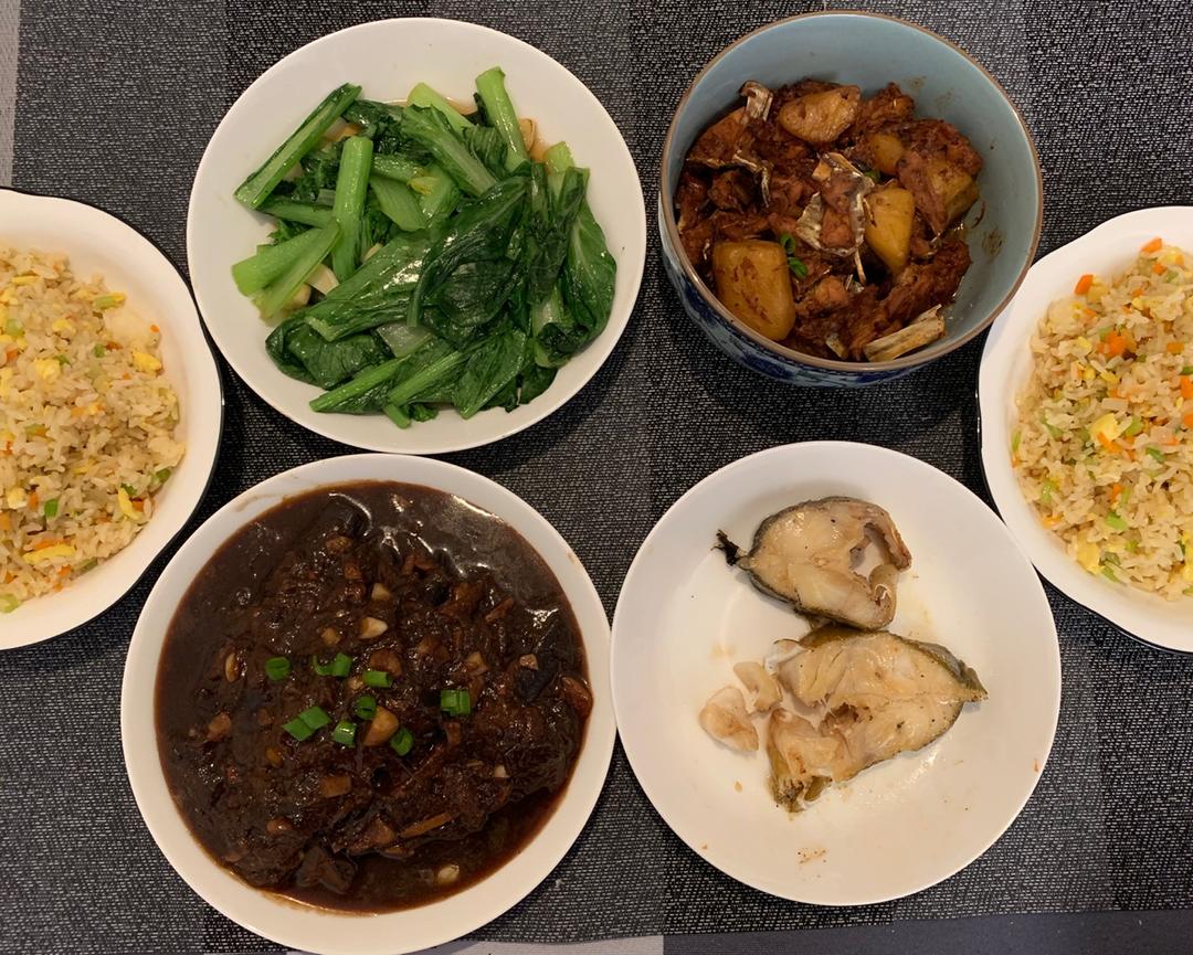 今日rich版二人晚饭:烧茄子、香煎鳕鱼、清炒小白菜、土豆烧鸡、素炒米饭。