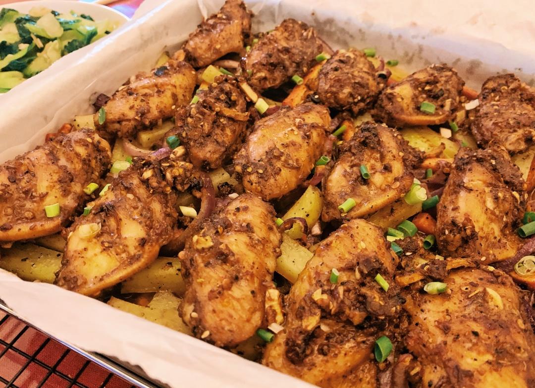 昨天腌了几乎一天的鸡翅 下面铺了土豆条 胡萝卜条 洋葱条