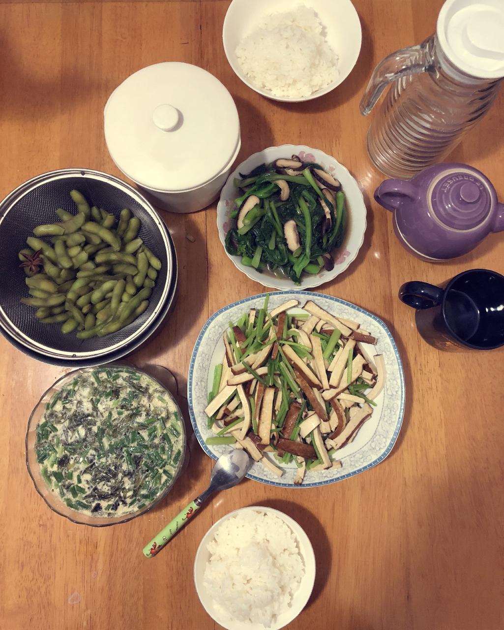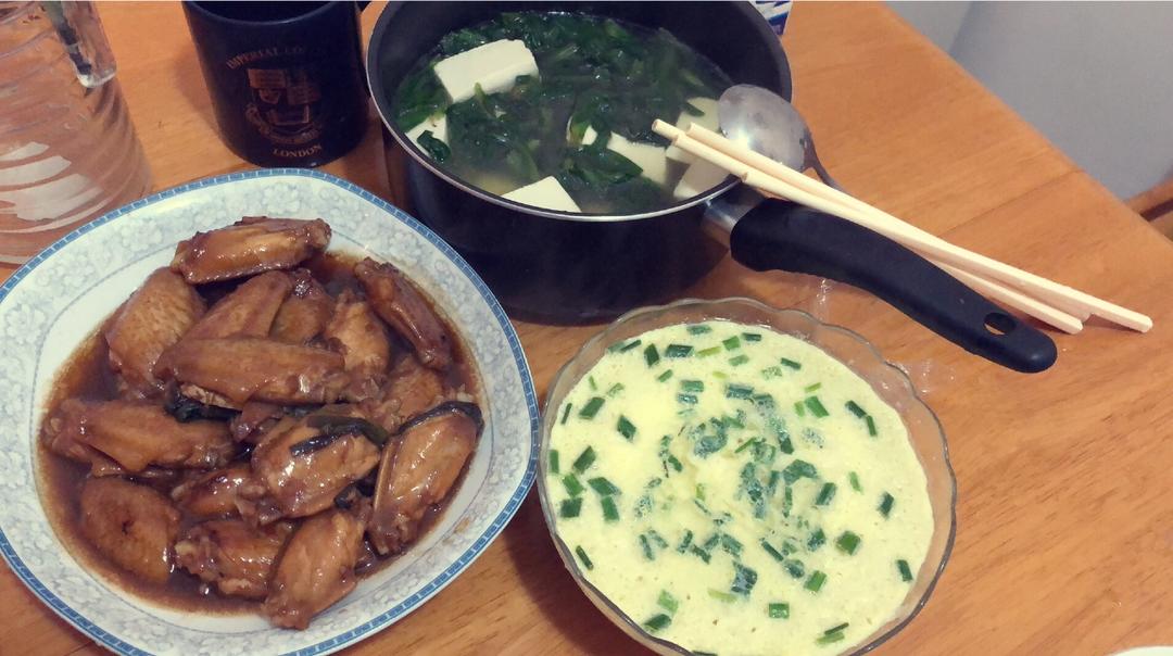 啤酒鸡翅🍺+🐔,炖蛋🥚,蓬蒿菜豆腐汤🌱