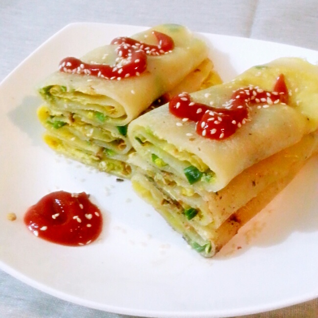 锅里擦一层油,开始中火,下锅后小火,转着锅烙一遍,然后倒入蛋液再转着烙,蛋液不淌了翻个,不会胡,颜色也好看#午餐•201...