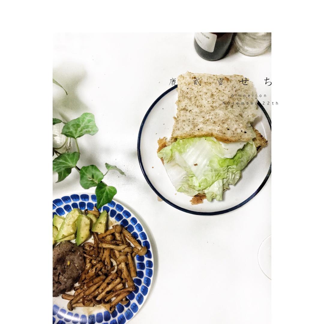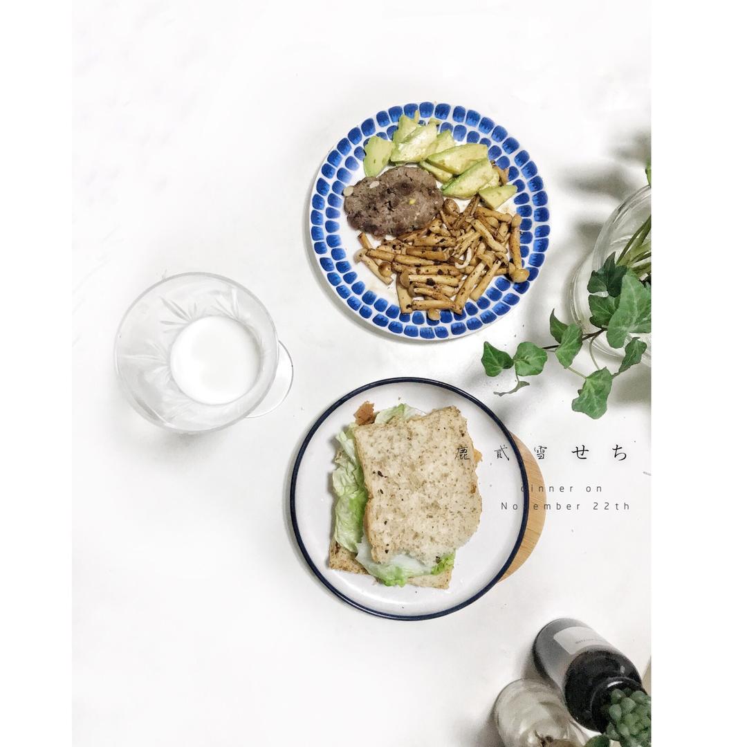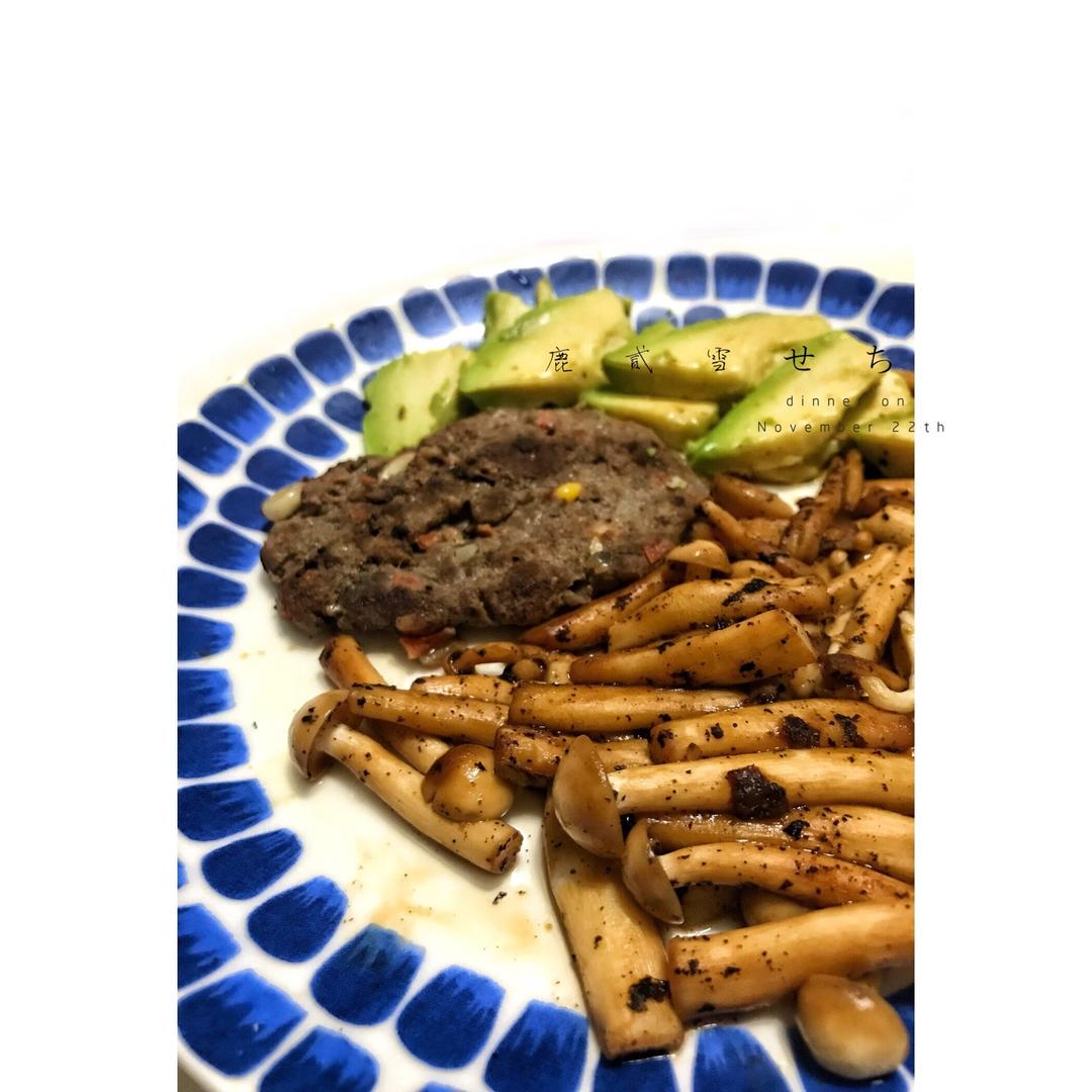 水煮白菜,牛肉饼,黑胡椒煎白玉菇,牛油果🥑