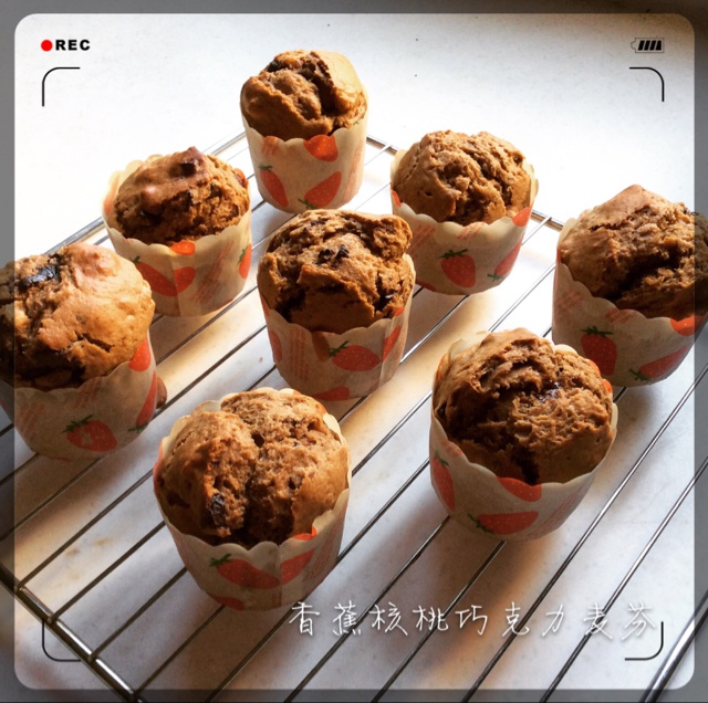 香蕉核桃巧克力麦芬。媳妇儿说要吃巧克力味的甜点,就做了这个。本不喜欢做麦芬,但是鉴于不用打蛋,简直是懒人福音。可可粉不够...